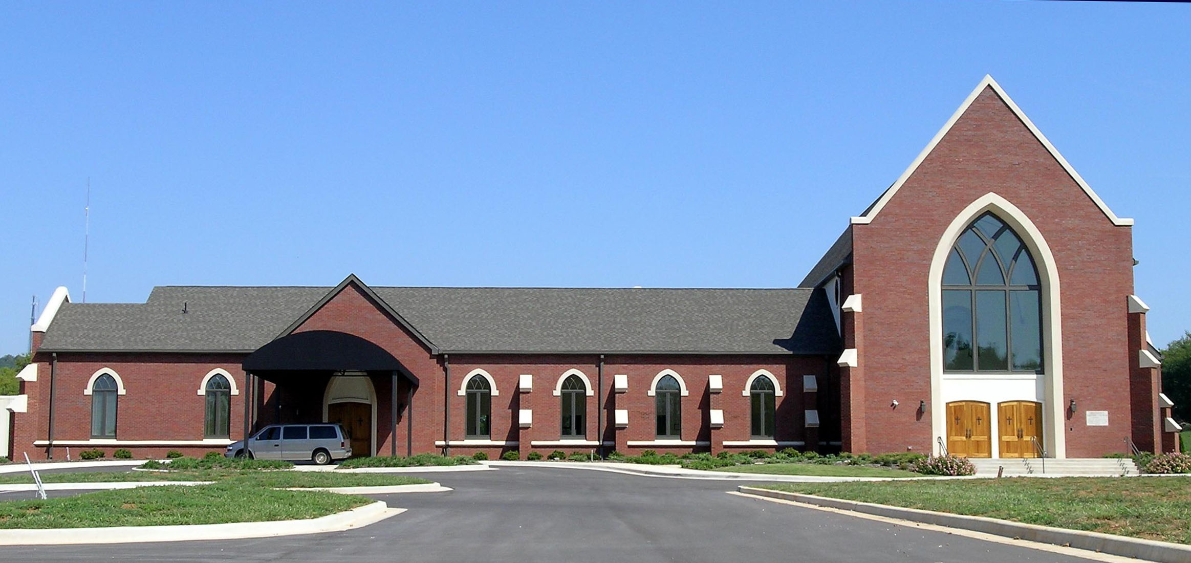 The 6,500 square foot Sanctuary is a Gothic Old World design with 51 foot high ceilings supported by exposed structural glue-laminated wood columns & beams and structural concrete block walls with a brick veneer and cast stone trim. The custom built highly arched windows accent the steep roof pitch. Inside the walls are Stucco over the concrete block, the floor is a custom designed tile, and main doors are custom imported stained wood.